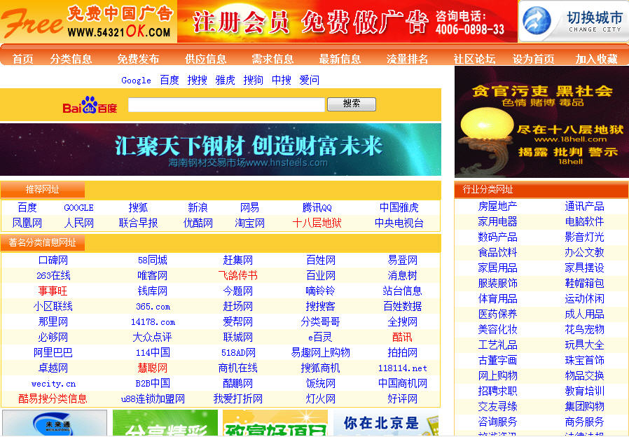免費(fèi)中國(guó)廣告網(wǎng)站致力于網(wǎng)絡(luò)信息分類模式的探索,開發(fā),建立,創(chuàng)新,是融分類信息導(dǎo)航和分類信息為一體的大型綜合門戶網(wǎng)站,旨在為訪問(wèn)者提供簡(jiǎn)潔,精準(zhǔn),及時(shí)的分類信息導(dǎo)航服務(wù)和免費(fèi)方便的分類信息發(fā)布平臺(tái), 聯(lián)合業(yè)界同仁共同開發(fā)網(wǎng)絡(luò)資源...