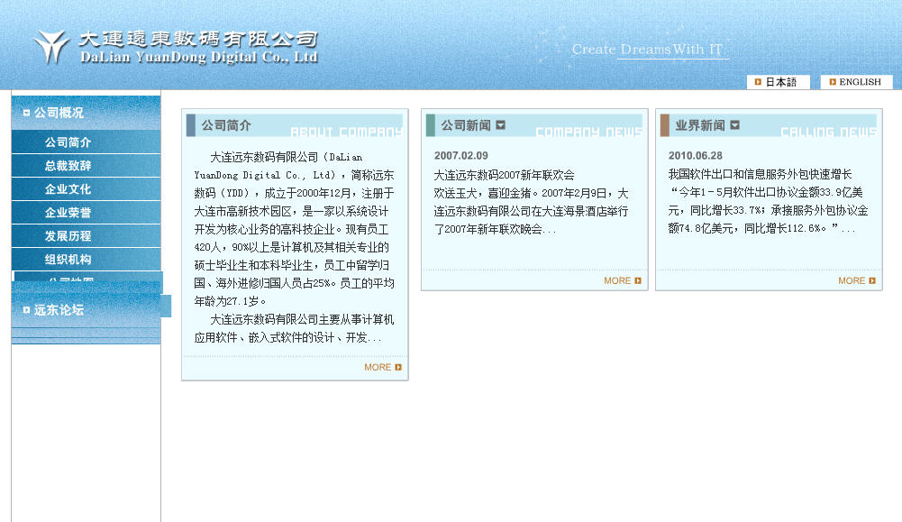 大連遠(yuǎn)東數(shù)碼有限公司(DaLian YuanDong Digital Co., Ltd),簡稱遠(yuǎn)東數(shù)碼(YDD),成立于2000年12月,注冊于大連市高新技術(shù)園區(qū),是一家以系統(tǒng)設(shè)計(jì)開發(fā)為核心業(yè)務(wù)的高科技企業(yè)。現(xiàn)有員工382人,90%以上是計(jì)算機(jī)及其相關(guān)專業(yè)的碩士畢業(yè)生和本科畢業(yè)生,員工中留學(xué)歸國、海外進(jìn)修歸國人員占21%。員工的平均年齡為25.8歲.