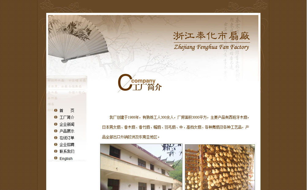 我廠創(chuàng)建于1988年,有熟練工人300余人,廠房面積3000平方,主要產(chǎn)品有西班牙木扇,日本男女扇、香木扇、香竹扇、帽扇、羽毛扇、中、高檔女扇、各種舞扇及各種工藝品,產(chǎn)品全部出口外銷歐洲及東南亞地區(qū).