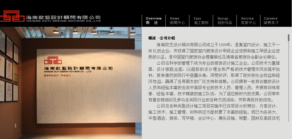 海南歐藝設(shè)計顧問有限公司成立于1999年,是集室內(nèi)設(shè)計、施工于一體化的企業(yè),并獲得了國家室內(nèi)裝飾設(shè)計甲級企業(yè),并獲得了國家室內(nèi)裝飾設(shè)計甲級企業(yè)資質(zhì)和施工甲級企業(yè)資質(zhì)的認(rèn)證。是中國室內(nèi)裝飾協(xié)會理事單位及海南省裝飾協(xié)會副會長單位。